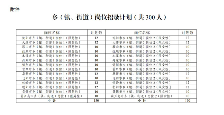 乡(镇、街道)单位岗位计划选调300人,面向选调范围内所有高校毕业生招录。