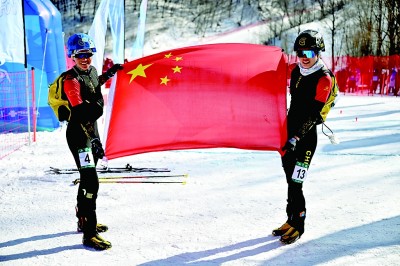 2月9日,中国选手包揽滑雪登山女子短距离项目前四名。图为次旦玉珍(左)与队友于婧萱庆祝