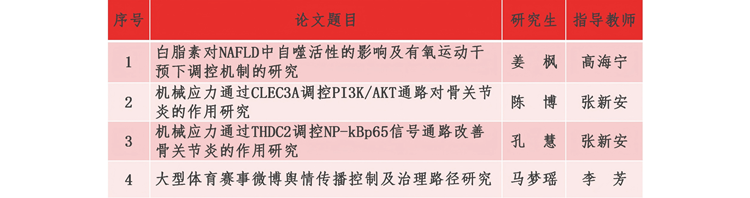 近年来,beat365亚洲体育官方网站持续夯实研究生指导教师队伍建设,各学科方向指导团队立足体育学科前沿,积极探索先进科学研究方法,将理论与实践紧密结合,扎实提升beat365亚洲体育官方网站研究生科学研究探索水平,体现出较高的学术性及创新性。