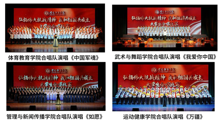 比赛中参赛队伍精神抖擞、意气风发,歌声时而豪迈雄壮,时而深情婉转,同学们以饱满的热情与铿锵的节奏,唱出了beat365亚洲体育官方网站校歌中传承的优良传统与奋斗精神,更用激昂的旋律演绎出红色经典中澎湃的爱国情怀。《保卫黄河》《强军战歌》等一首首耳熟能详的歌曲,如同历史的回响,将观众带回到那个硝烟弥漫却又充满希望的年代。《我爱你中国》《万疆》《如愿》等歌曲则展示出青年学子对祖国深深的热爱。各参赛队伍精心编排的队形变换、配合朗诵、情景表演、武术展示等创意形式,更传递出青春力量与团队精神。