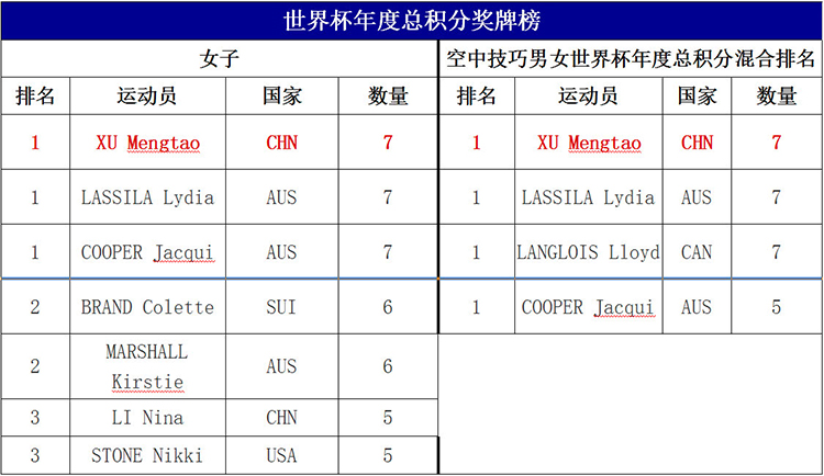 表7 徐梦桃世界杯年度总积分奖牌榜