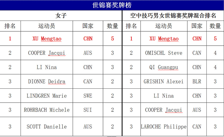 从表8可以看到:全世界空中技巧男女选手共同排名,徐梦桃是目前获得世锦赛奖牌最多的运动员!