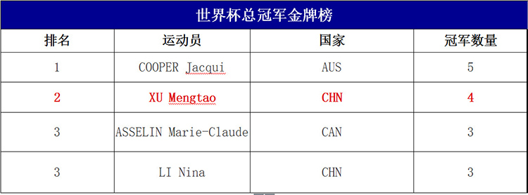 从表6可以看到:徐梦桃共计获得4次世界杯总冠军!而目前排名第一的澳大利亚运动员已经退役,所以,徐梦桃必将超越她并创造新的历史!!
