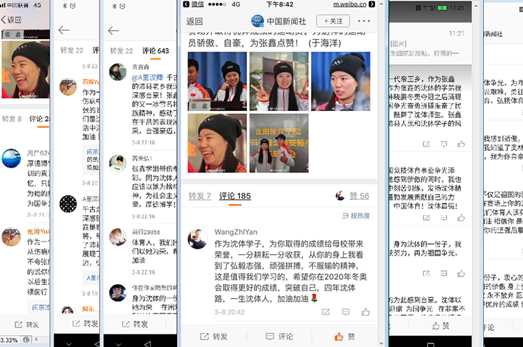 学生点赞活动截屏 3月8日,体育教育学院团委开展“青年有为有志,为英雄点赞“活动,体育教育学院640余名学生积极参与互动,发表评论640余篇。 在本届冬奥会上我院自主培养的自由式滑雪空中技巧女子运动员张鑫等人带伤参战,为国争光。3月3日,新华社发表了《为绑着冰袋夺得冬奥会银牌的张鑫点赞》一文,讲述了运动员张鑫带伤参加比赛的感情经历。体育教育学院团委号召学院全体青年学生向张鑫等运动员学习,为她们点赞。 新闻作者:体育教育学院 李丁皓 责任编辑:朱翠立 新闻日期:2018-03-09 点击:次