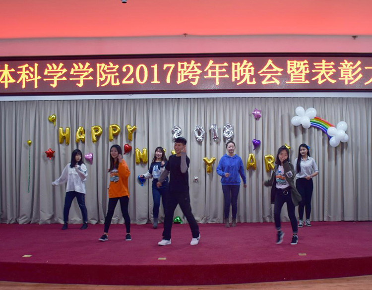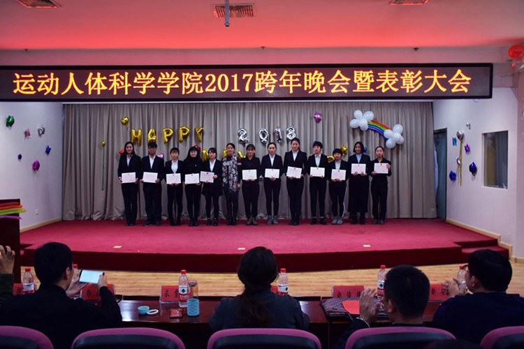 1月4日,为表彰先进,丰富学生课余文化生活,运动人体科学学院在图书馆二楼报告厅举办2017年跨年晚会暨表彰大会。学生工作部(武装部)副部长郭大军,运动人体科学学院领导班子以及各教研室主任、党支部书记和辅导员老师出席活动。