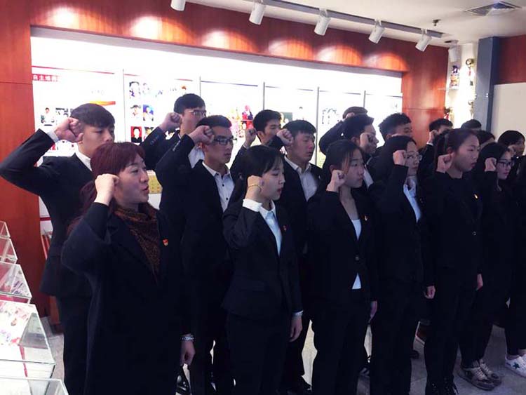 在大会上,新发展的党员同志面对党旗郑重宣誓。