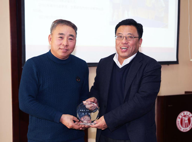 党委书记姚守齐(右)向退休教工刘建志颁发纪念品