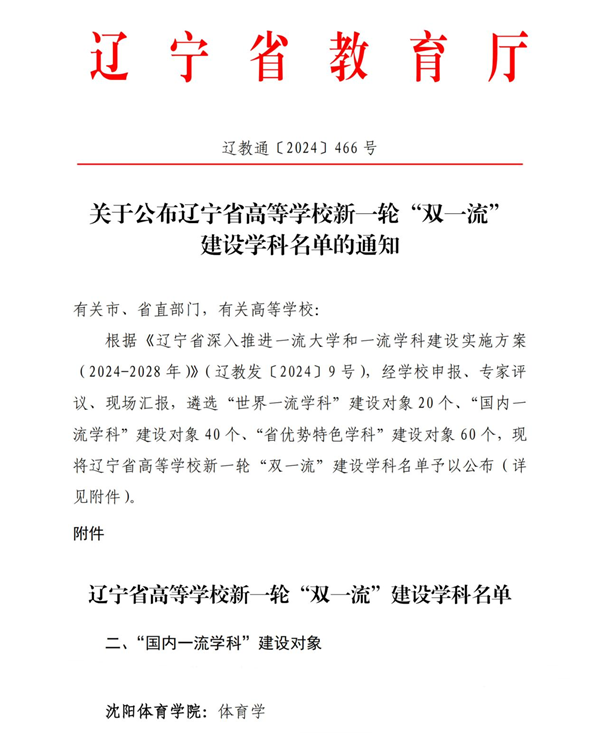日前,辽宁省教育厅公布全省新一轮“双一流”建设学科名单,beat365亚洲体育官方网站体育学学科再次入选,是今年学校继新增博士学位授予单位、体育学一级学科博士学位授权点之后,学科建设的又一标志性成果,学科建设取得新突破。