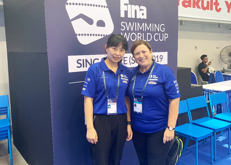 魏梅副教授(左一)在2019年国际泳联游泳世界杯新加坡站工作现场