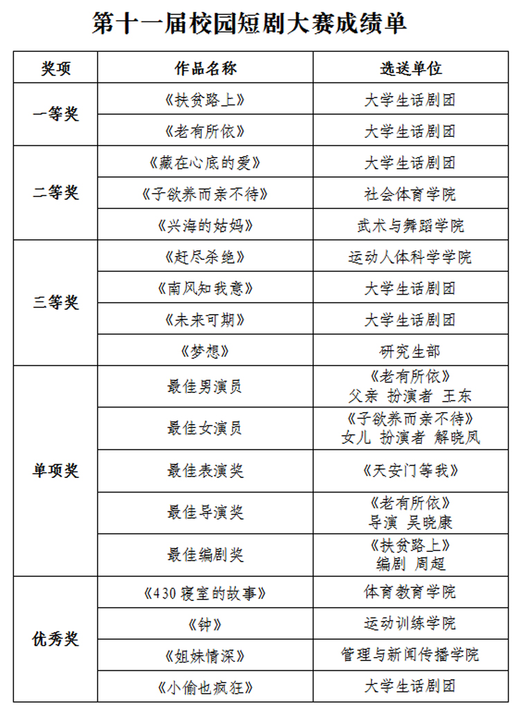 通过激烈的角逐,最终由大学生话剧团选送的《老有所依》和《扶贫路上》获得一等奖。