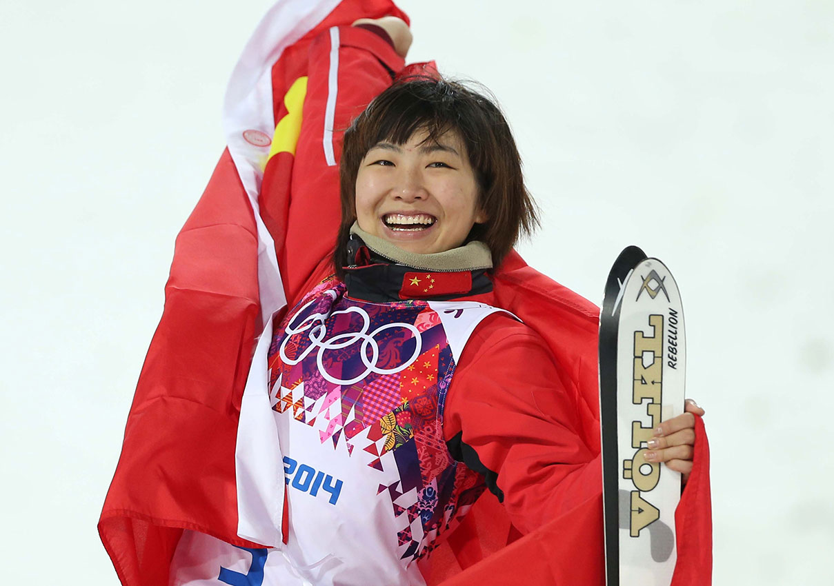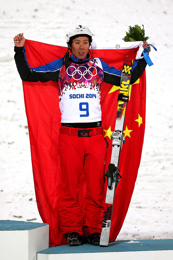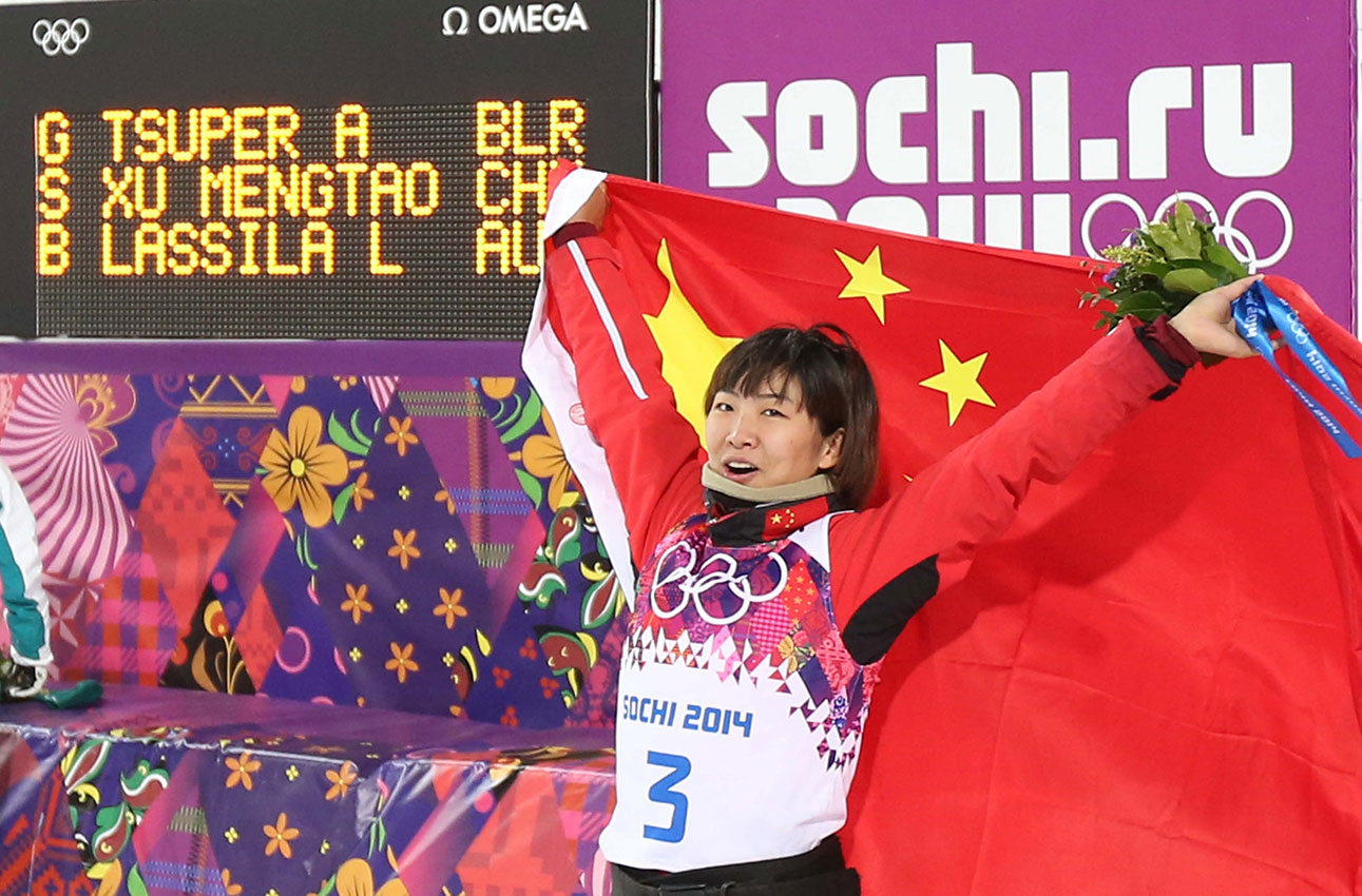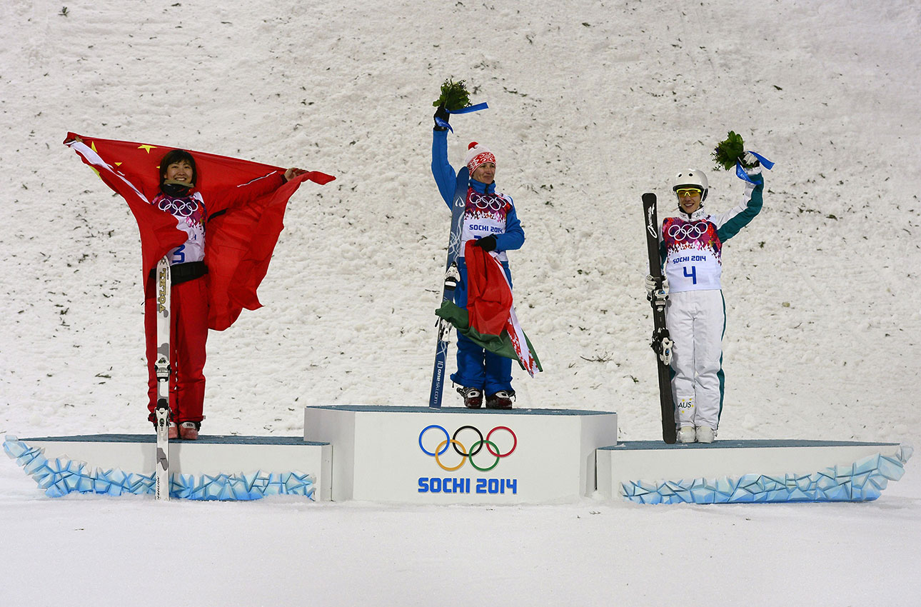 2014年索契冬奥会,beat365运动员徐梦桃以83.50分夺得自由式滑雪女子空中技巧比赛银牌。图为领奖台上的徐梦桃。