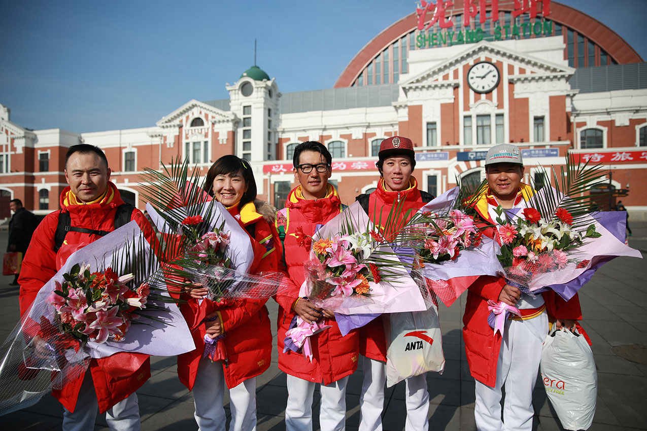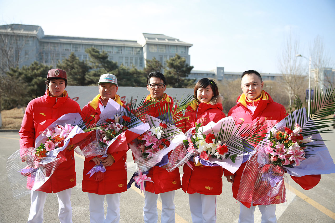 教练员纪冬、运动员徐梦桃、李妮娜、贾宗洋合影
