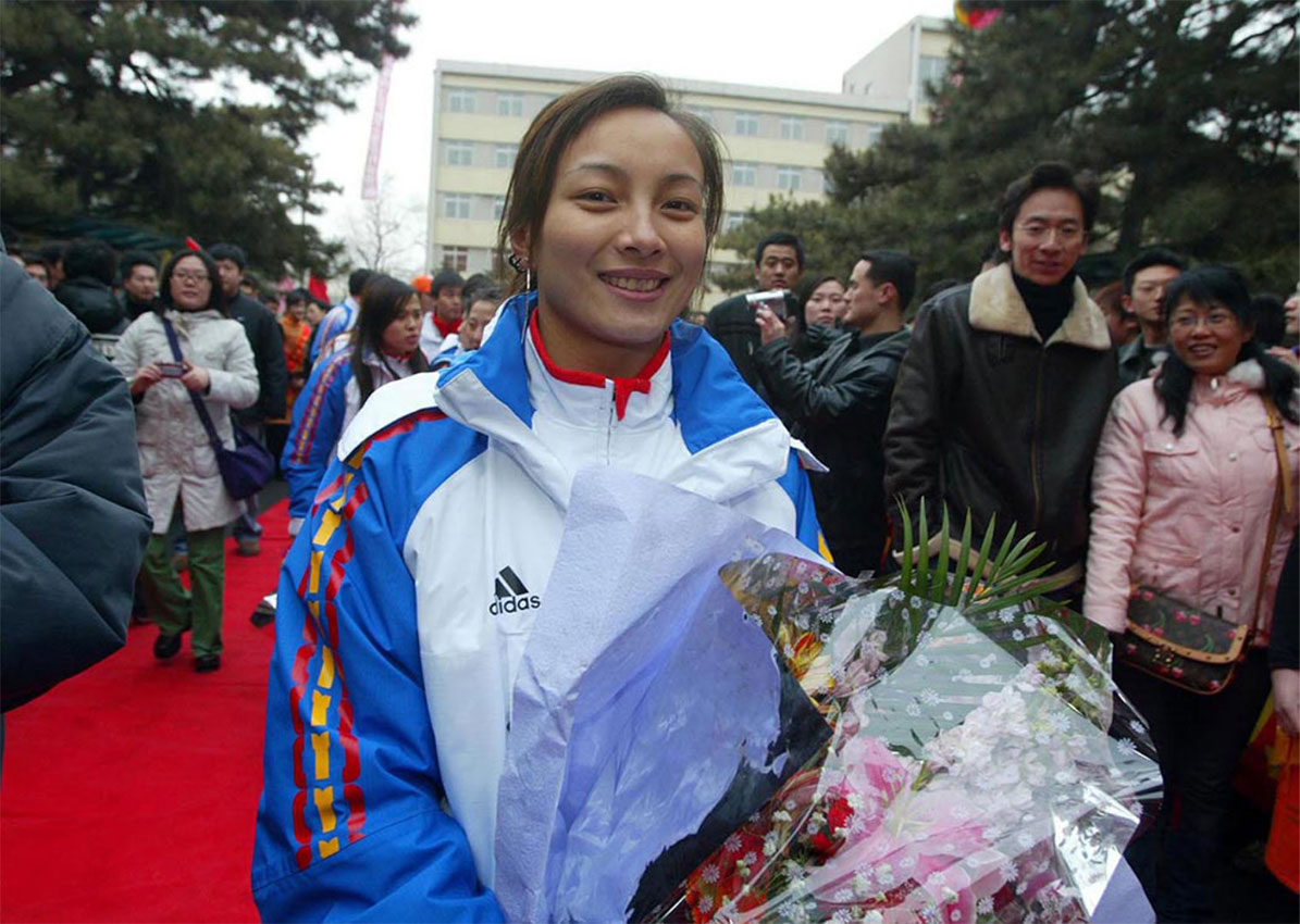 母校欢迎为国争光的运动健儿载誉归来,图为李妮娜。