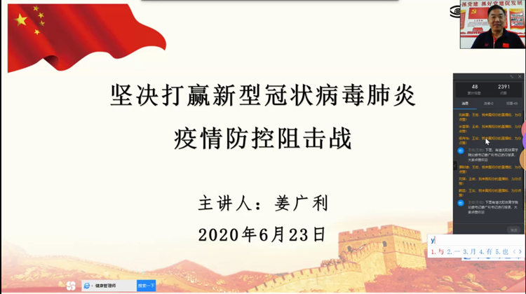 6月22日,纪委书记姜广利以《坚决打赢新型冠状病毒肺炎疫情防控阻击战》为题,利用钉钉直播,为管理与新闻传播学院2019级新闻1班、2班全体学生上了一堂生动的形势与政策课。