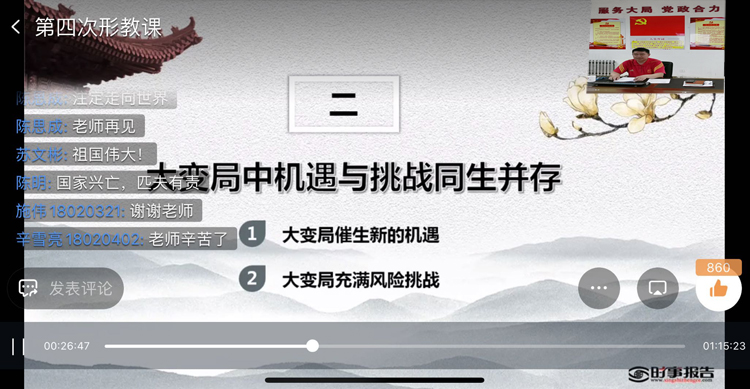 在近两个小时的课程中,刘征深入分析了国内外政治、经济环境变化,讲述了我国目前面临的内外部矛盾以及在世界大变局中的角色和地位,面临的机遇和挑战。他通过生动丰富的案例和观看视频的方式,带领学生回顾了近几年我国在人工智能、制造业、互联网、大数据等领域取得的突破性成绩,让学生深入了解了我国的改革开放成就,进一步激发了学生的民族自豪感和爱国热情。